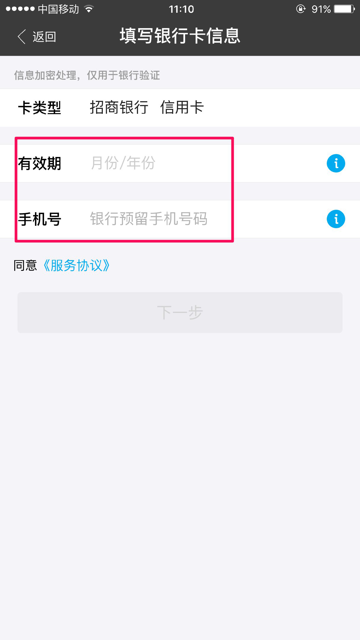 跳转到如下页面,填写储蓄卡类型与该银行卡在银行预留手机号