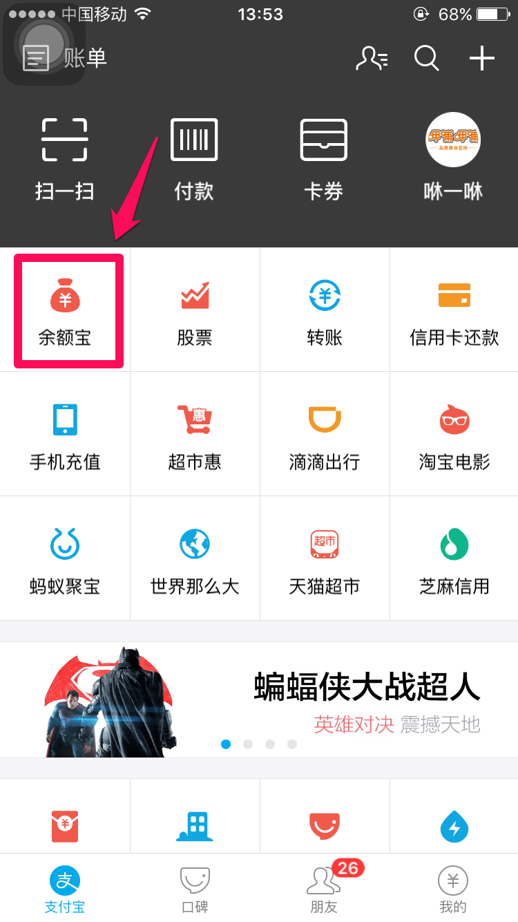 打开支付宝,选择首页中的“余额宝”