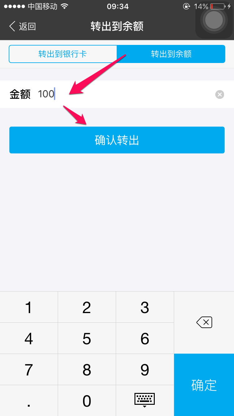 选好要转出的银行卡后,输入要转出的金额,点击确认转出