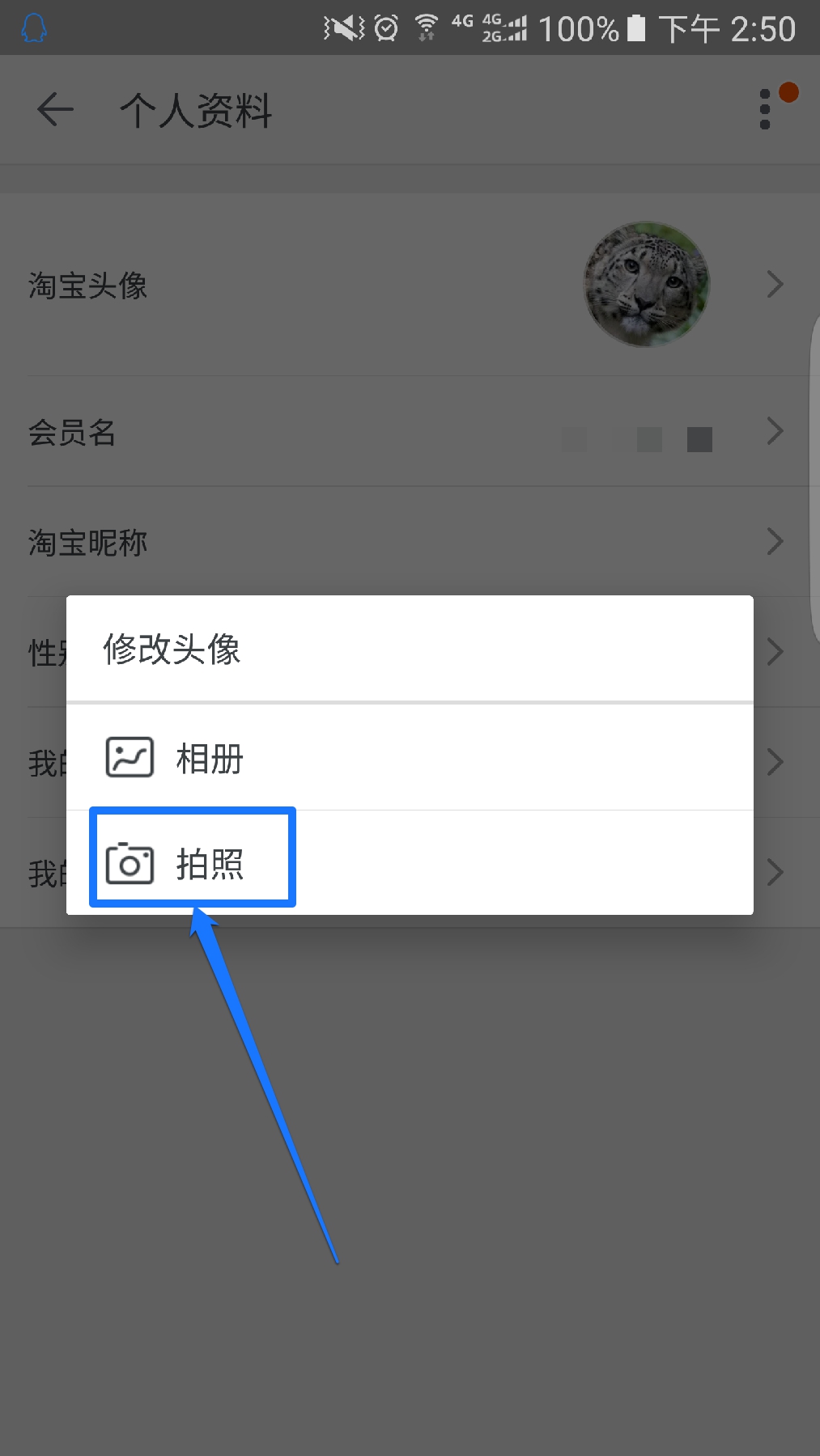 点击“拍照”,也可以选择现场拍摄一张图片作为您的淘宝头像