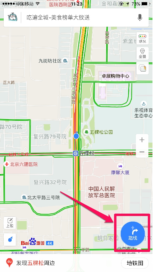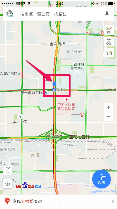 我们以从当前位置(五棵松)到公主坟为目的地进行路线查询,首先需要搜索要去往的目的地。如下图所示,在红框内搜索地点