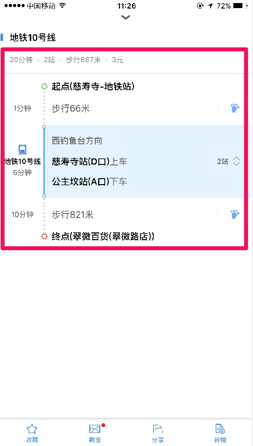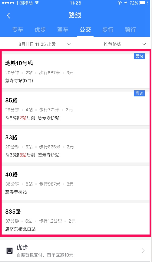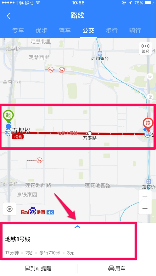 点击后会出现从当前位置到公主坟的交通路线推荐,上方为出行方式的选择,我们先选择“公交”的出行方式,乘地铁去往公主坟