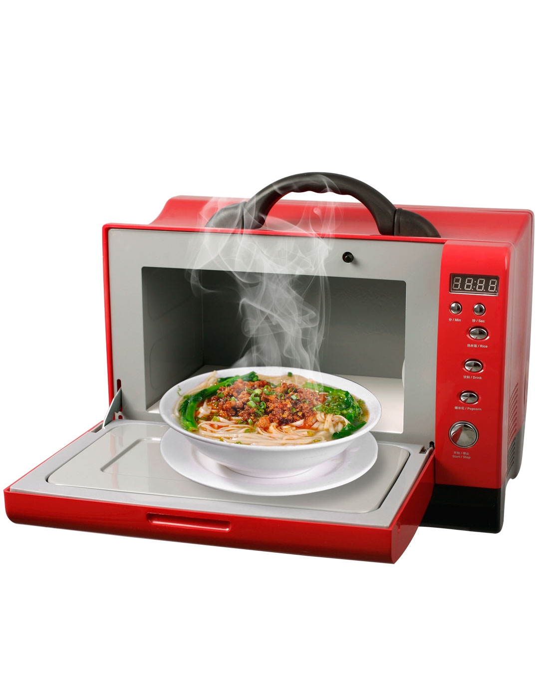 加热馒头、米饭等容易发硬的食物,可在 表面淋点水,高火加热1 - 2分钟即可。