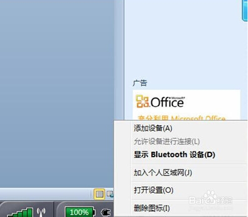 首先确认电脑的蓝牙开启,蓝牙灯正常,并开启蓝牙耳机的开关。点击系统右下角蓝牙图标,选择“添加设备” 。