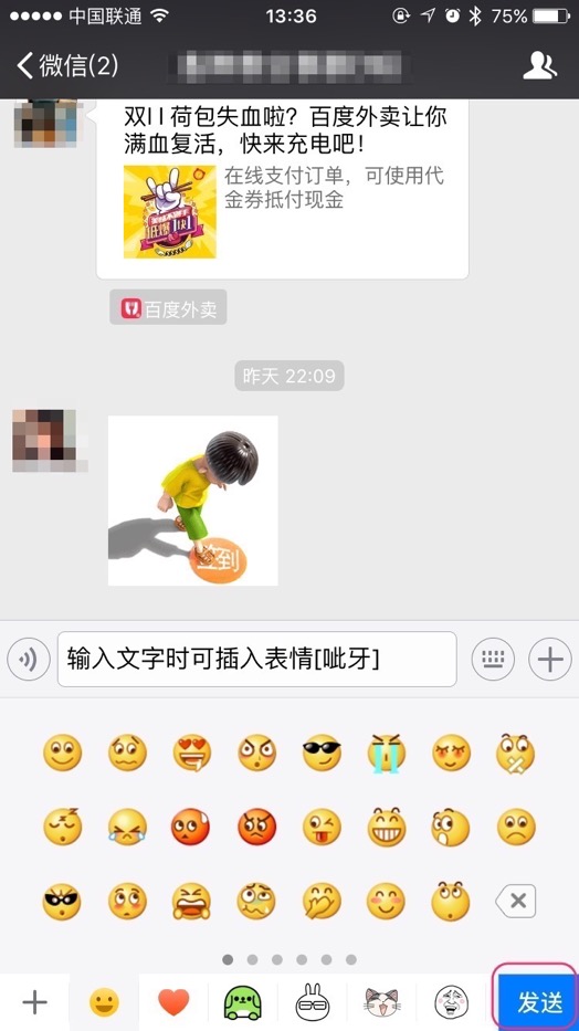 表情显示在文本框下方,可左右滑动查看,要插入那个就点那个,可以插入多个。选好后点右下角的蓝色“发送”按钮将信息发送出去