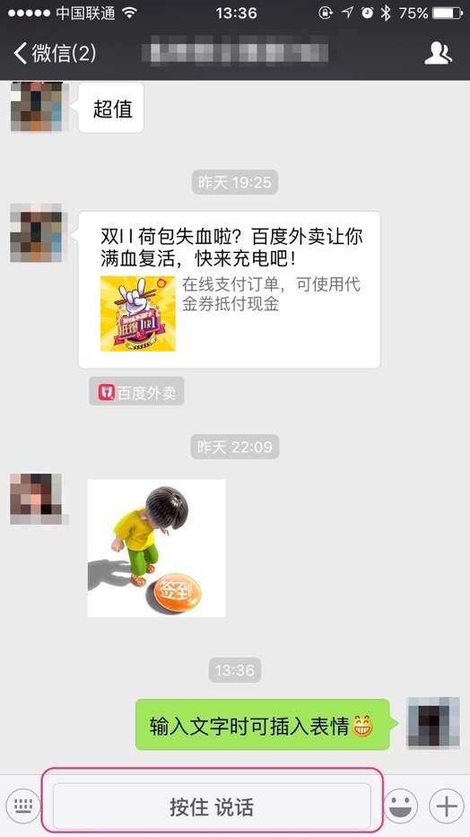 可看到信息已经发给对方了,除了文本信息外还可直接发送语音信息,点屏幕左侧红色线框圈中的按钮即可进入语音发送界面。