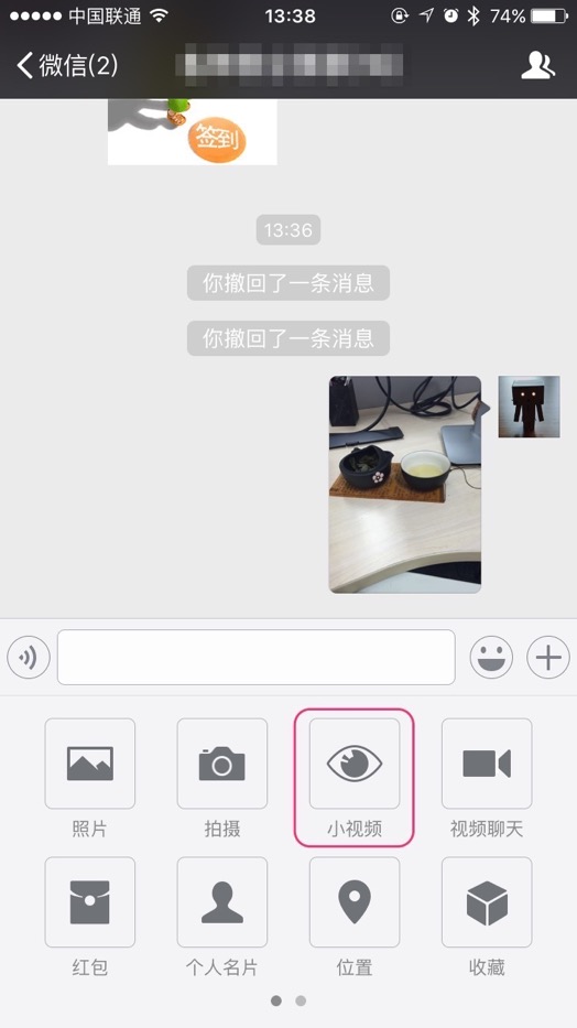 可以看到照片已经发送给您的朋友了,微信还可拍摄小视频,这种方式拍摄的视频比较节省流量,适合在没有wifi的环境下使用,要发送小视频点“小视频”按钮