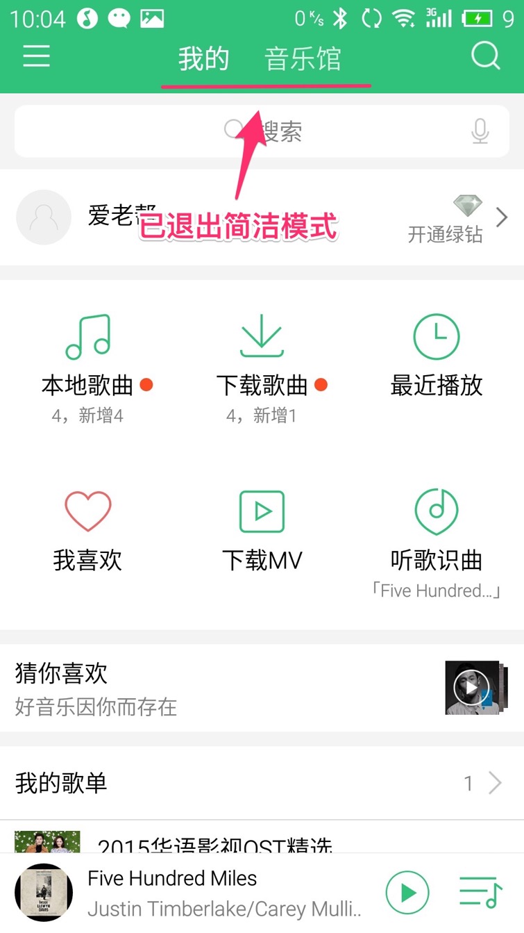 已进入简洁模式,简洁模式中原先顶部的“我、音乐馆、简洁”等字样将变成图标,听音识曲功能按钮将移动到界面右上区域