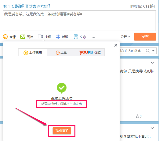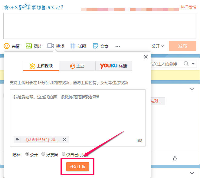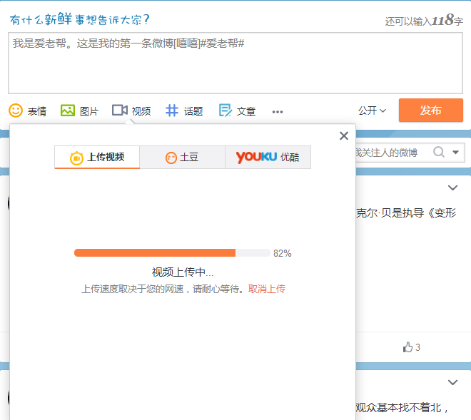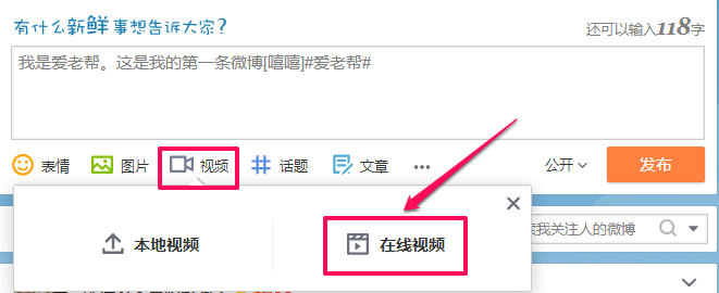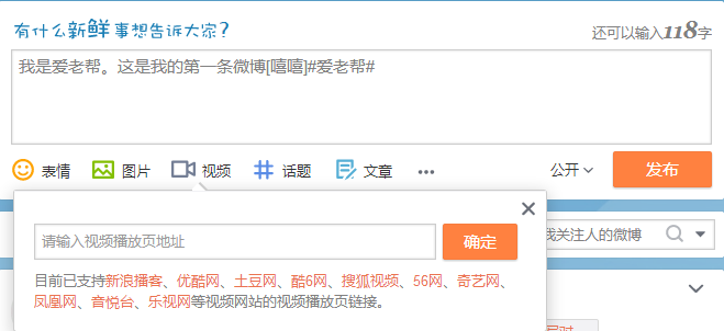 • 选择发布在线视频时,支持选择新浪博客、优酷、土豆、酷6、搜狐视频、爱奇艺等网站的视频链接。请确认您要发布的视频来自于这些网站