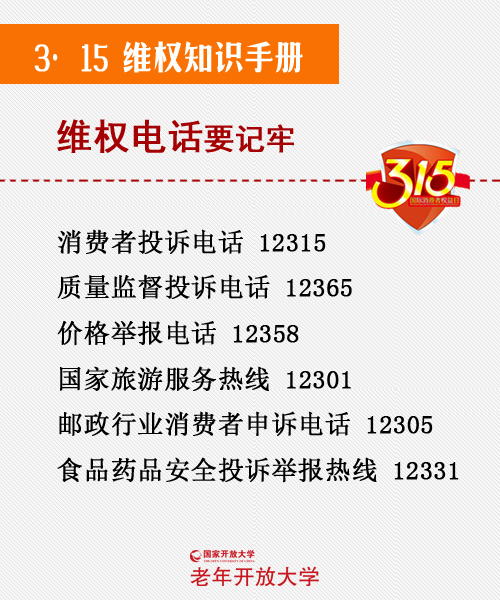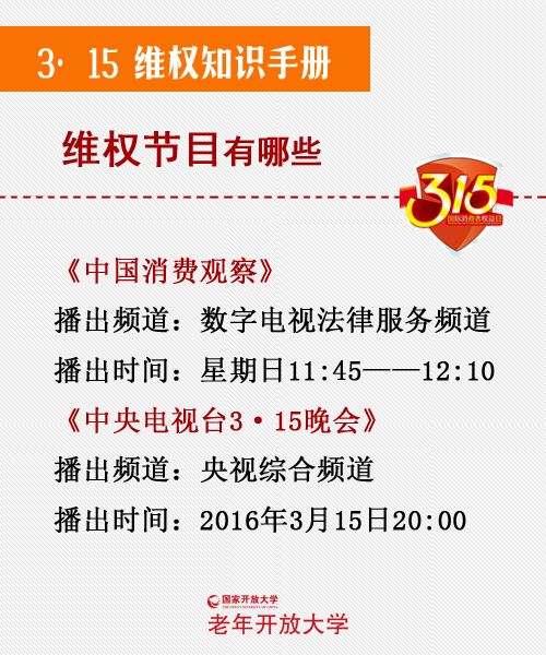 每年3月15日,中央电视台播出的“3·15晚会”会公布上一年关于消费维权、消费侵权及处理情况,发布消费预警,您有时间不妨看一看,对保护您的消费权益有很大帮助。